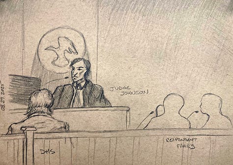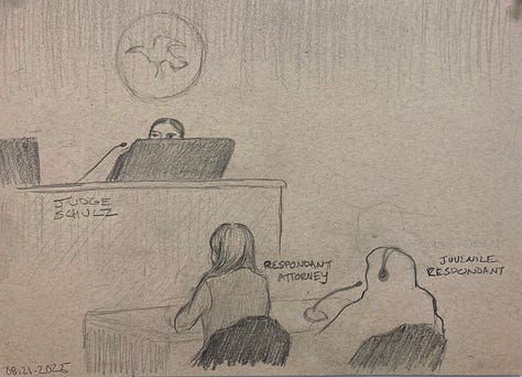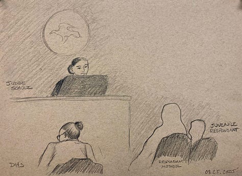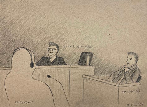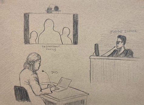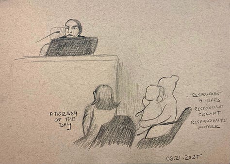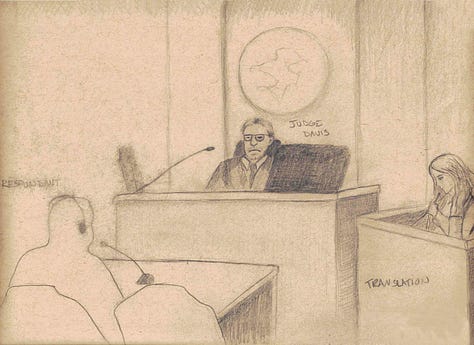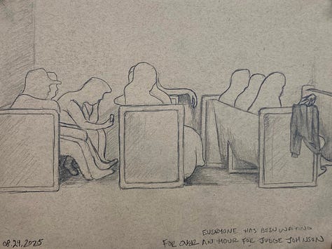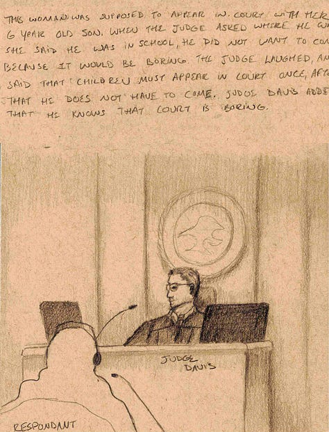 When I first started going to court, I hoped to remain anonymous. However, I was outed to the court early on by Judge Swink, one of the judges who has since been fired. Identifying me and my drawing was not out of animosity; rather, she seemed pleased that someone was paying attention.