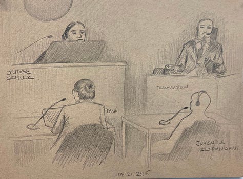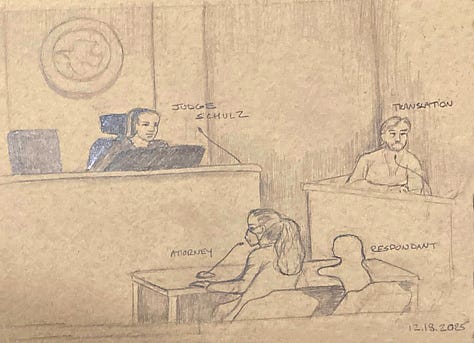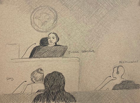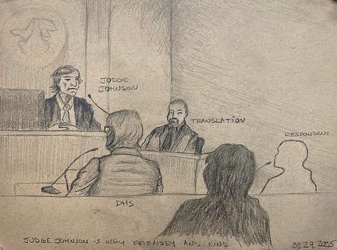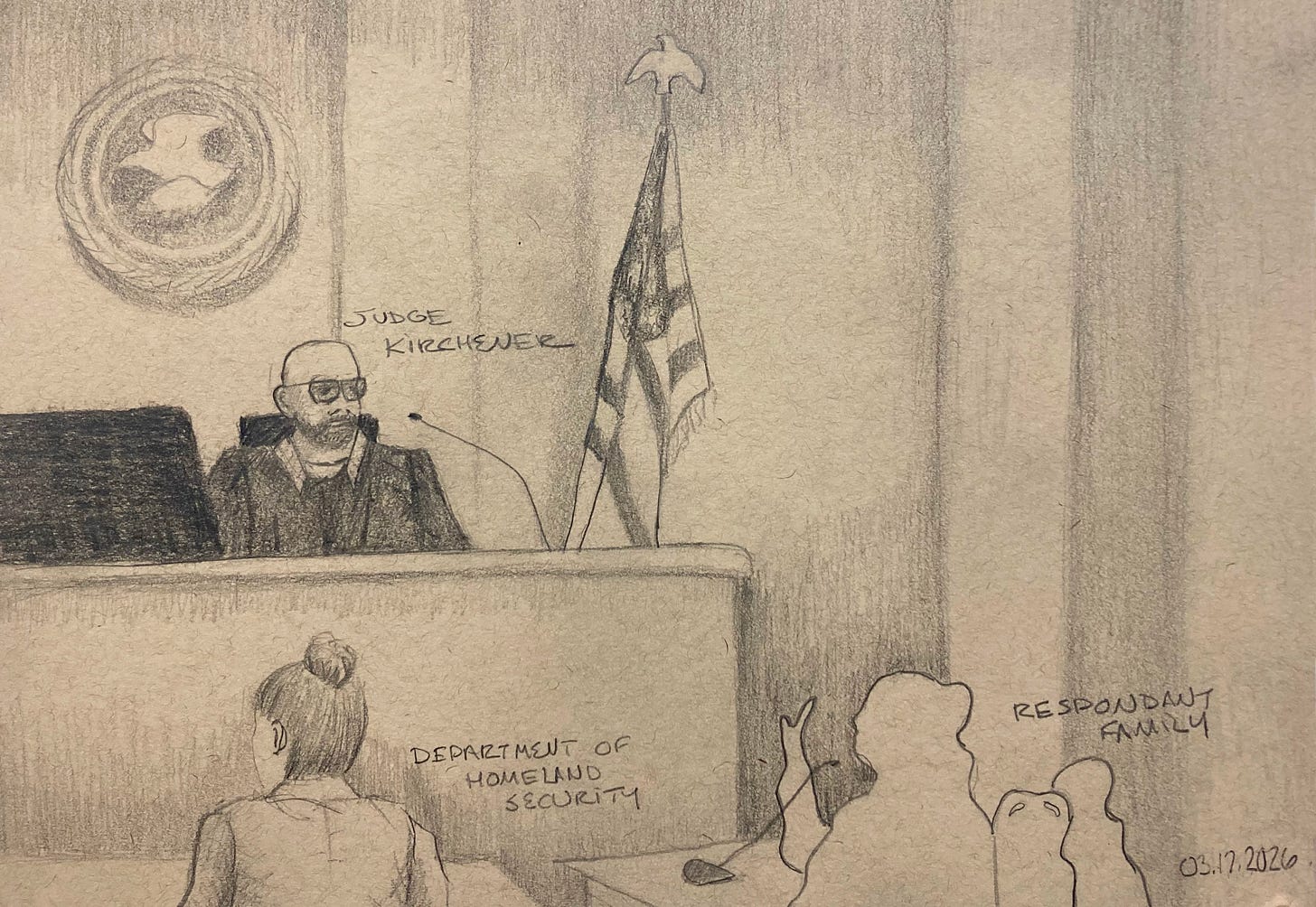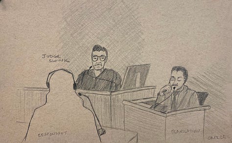 In addition to witnessing the stories of asylum seekers, my drawings have inadvertently become evidence of the breakdown of the San Francisco Immigration Court. Since September of 2025, all but seven of the judges on the court have been fired by the Trump administration for having “too high” of an asylum-granting rate. In January, three more judges retired. In March 2026, two more judges were transferred to other districts, leaving only two judges on the San Francisco court. There are plans to permanently close the court in January of 2027.