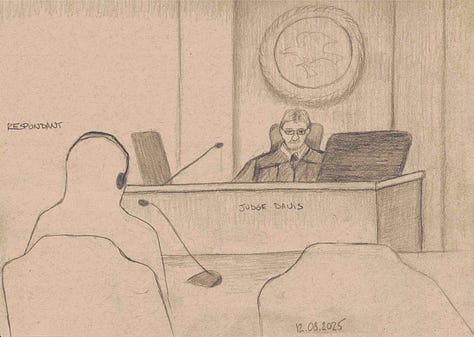 I’d like to say that when I arrived that first day I was cool and confident, walking in as if I belonged there. Instead I was a nervous, flustered wreck, and I wasn’t even on trial. I was uncertain how I was even going to make these drawings, because I knew that I needed to protect the identities of the asylum seekers in court.