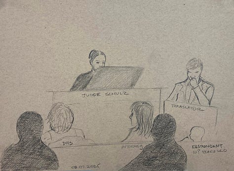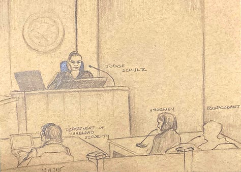 In the summer of 2025, as the Trump Administration was ramping up their deportation activities, I began serving as a Court Observer in the San Francisco Immigration Courts. My official mission was to be on the ground to witness any dismissals and to call the Bay Area Rapid Response Network to assure that attorneys could intercede in their possible deportations. Unlike other Court Observers, though, I had a secret mission: to draw the immigration courts. More precisely, I was going to try and draw ICE officers without their masks.