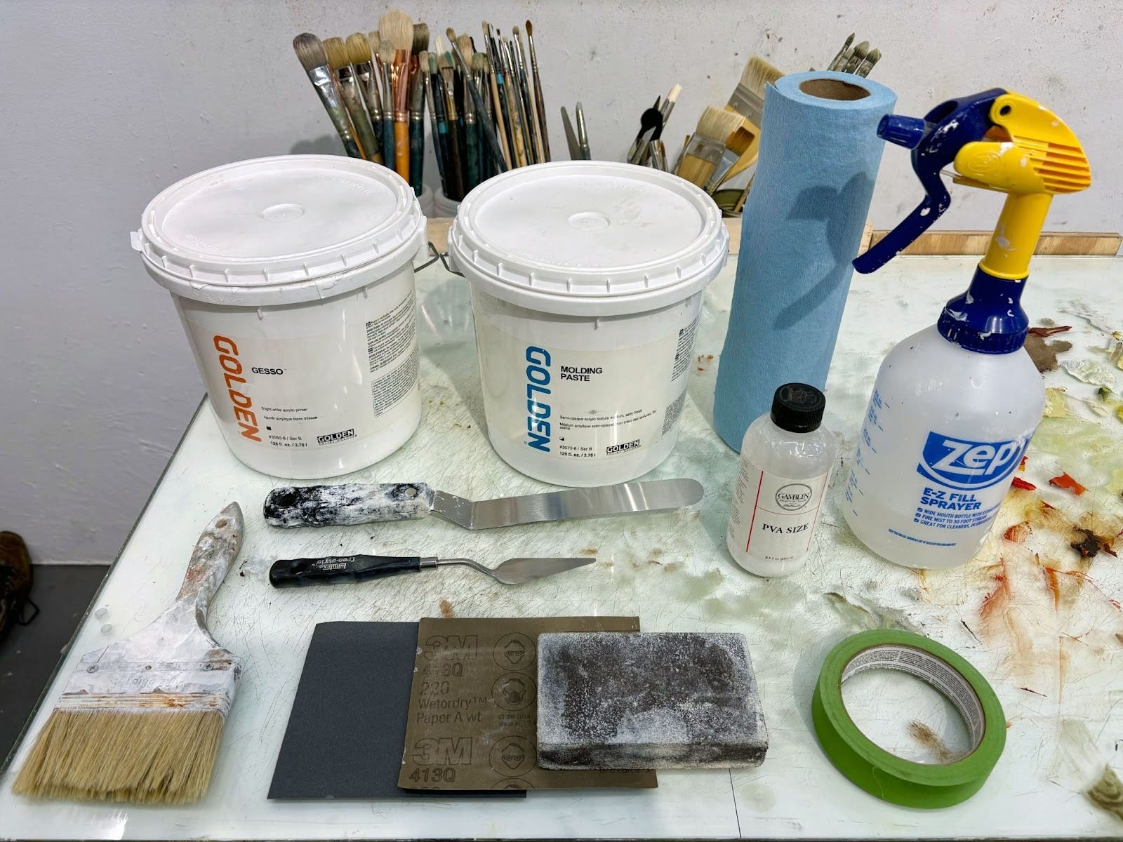 The molding paste we’re using for this project is a water-based product made by GOLDEN that has a thick consistency and forms a flexible, semi-opaque film when it dries. It is often mixed directly with acrylic paints for textured impasto techniques. However, when applied in layers directly to a support and wet-sanded, it creates a uniquely smooth, glass-like ground that allows oils and acrylics to glide like watercolor. The ground we are preparing is intended for use with oil or acrylic paint.